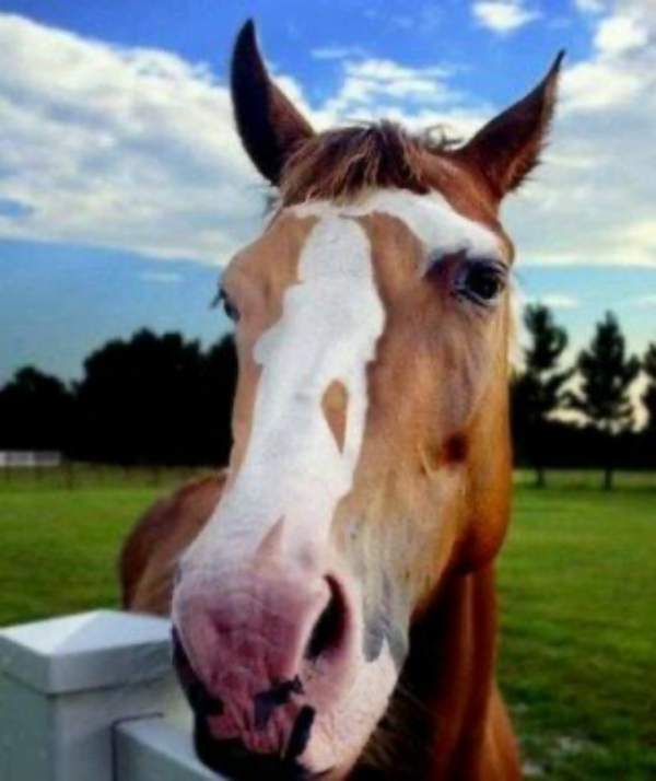 얼굴에 독특한 하얀 무늬를 지닌 말 사진입니다.