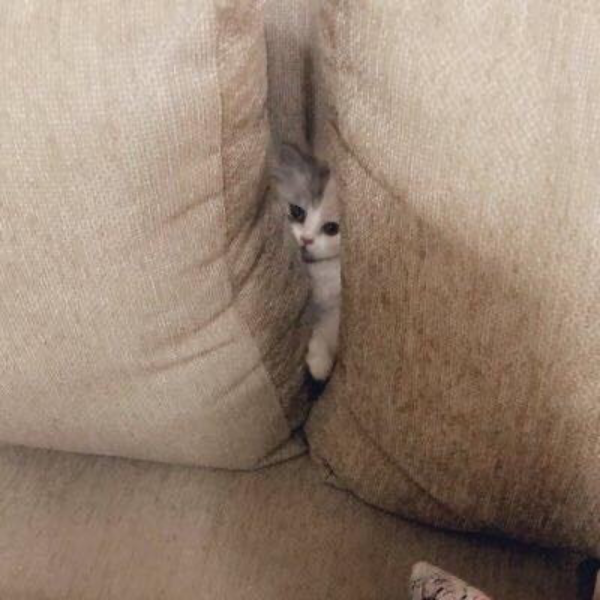 쿠션 사이에 숨어있는 아기 고양이의 사진이 되겠습니다.